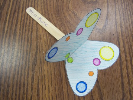 My teens cut out the butterflies, I folded and taped them to popsicle sticks to make the puppets. The kids got to make some beautiful colored butterflies and really loved making the wings go up and down! I got the craft from: Preschool Corner.