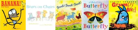 Even though I was sick during this storytime, I think that it was another rousing success. The kids had a lot of fun making farm noises during “Book, Book, Book,” but the best part of storytime was when I read “Grumpy Bird.” I had everyone make grumpy faces along with me as I read. They alternated between pursing their lips and scrunching up their foreheads and pouting to hysterical laughter. And I figured out a way to let everyone greet Applesauce during storytime by using a set of apples numbered to let everyone have their own turn to pat the puppy.