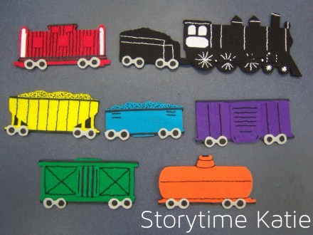 […] the freight train cars I used colored craft foam, a black permanent marker and the pattern used by Storytime Katie for her Clickety- Clack flannel board. This flannel board is amazing, I just translated it into […]