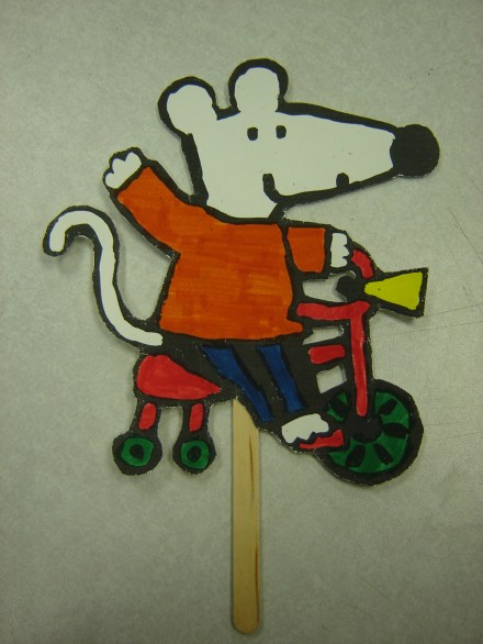 Followed by a quick craft of making Maisy ears (also on the official site) and a puppet coloring craft of Maisy riding a bicycle.