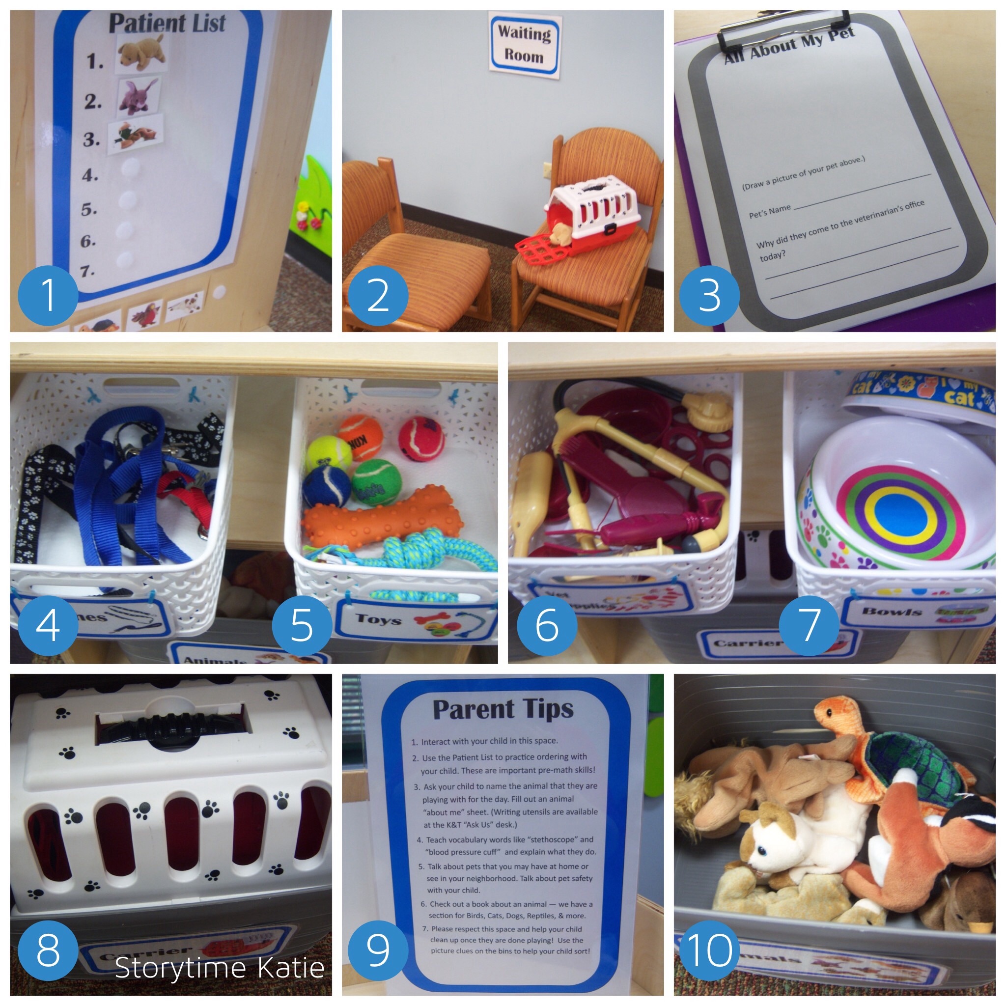 This was a hand-made item. I laminated the blank Patient List and also laminated pictures for each animal in our center. I used the Velcro dots to make this an area for kids to practice ordering. I wanted to provide this option for the children who are not yet writing to be able to “take” patients and ordering/sorting is a great early math skill.