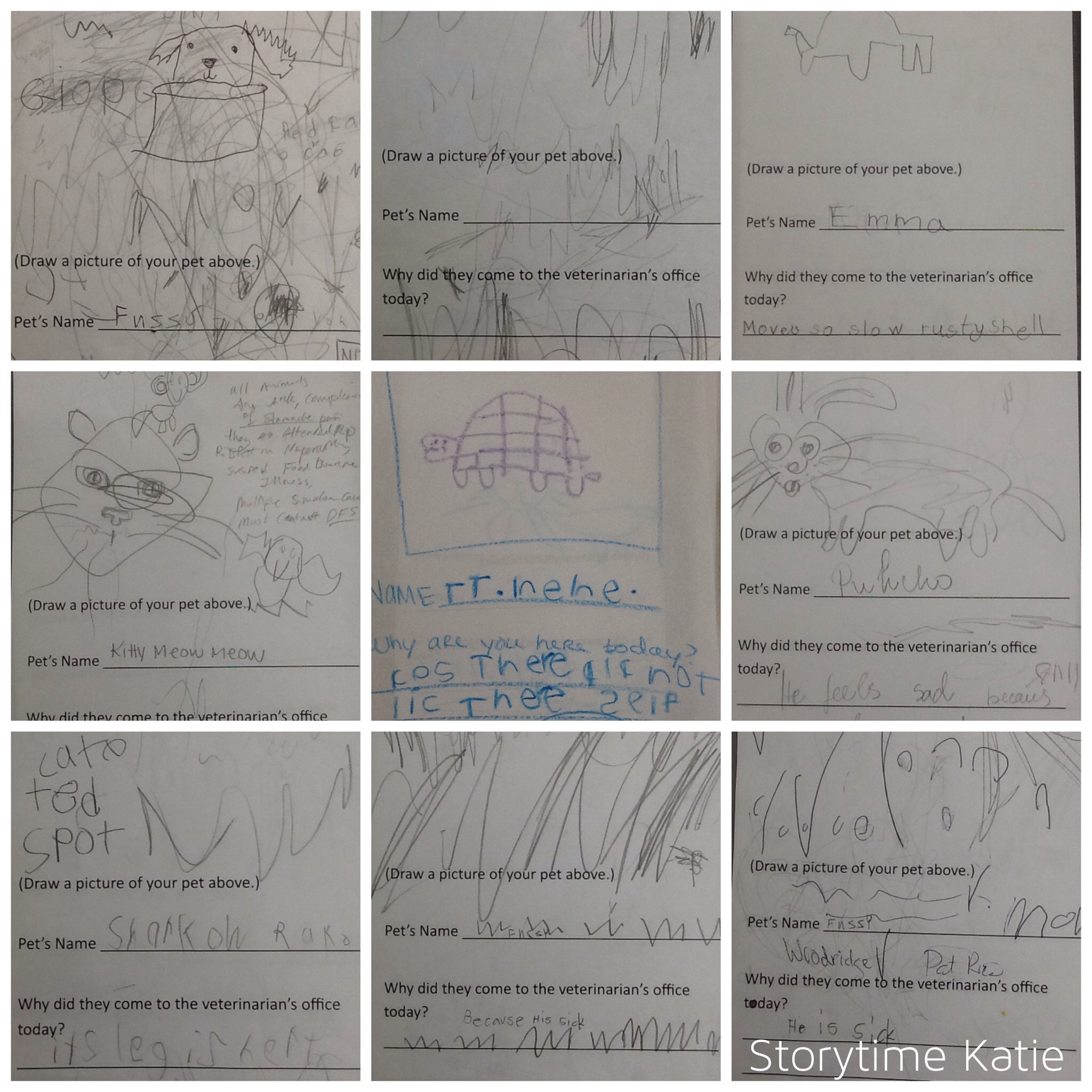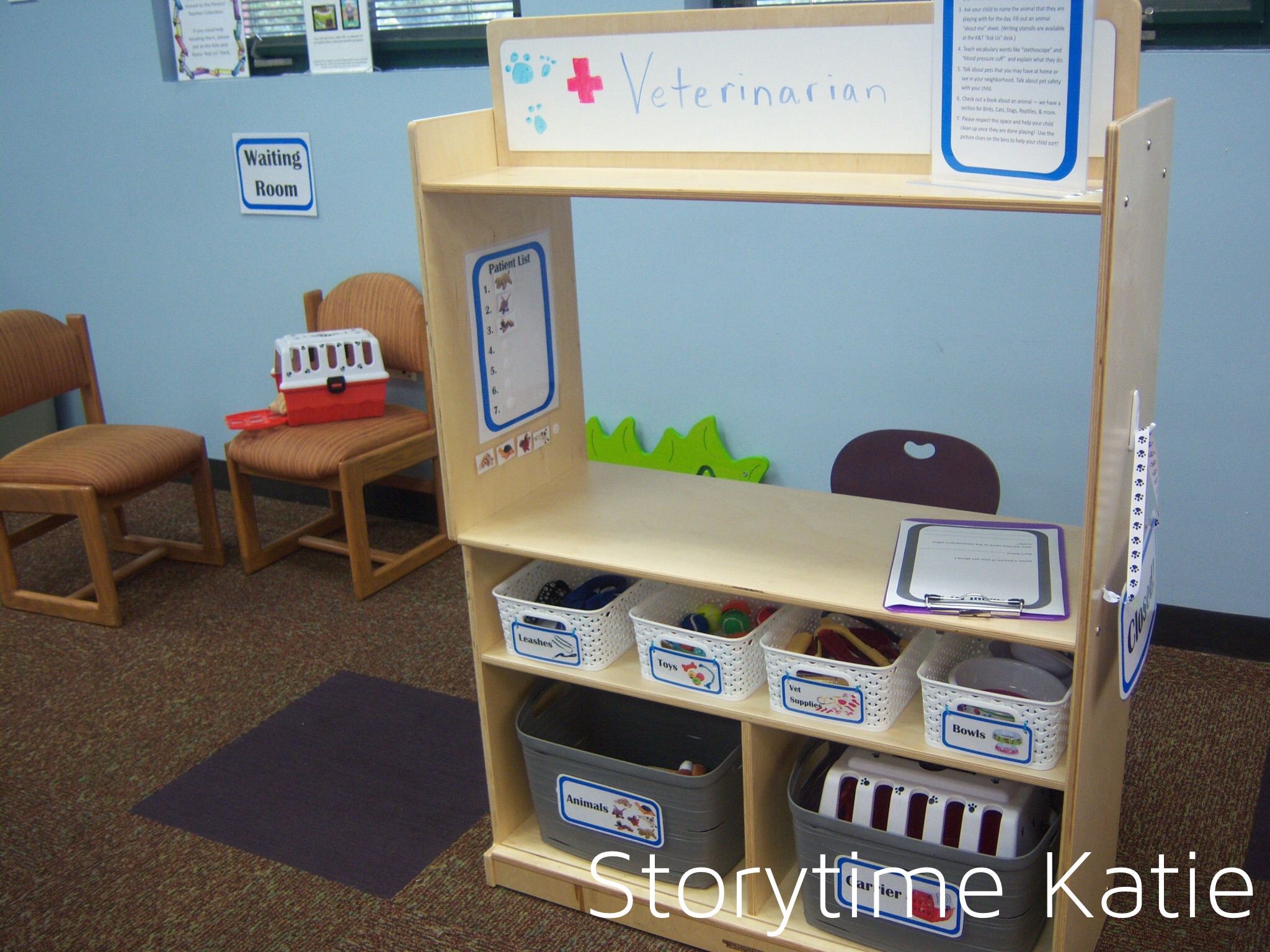 I made a worksheet for kids to write and talk about why their animals are visiting the veterinarian’s office that day. These were both general supplies found around our workroom. [This was a test situation to see if doing a post office was possible later on. I wanted to see if markers/crayons/pencils would wind up on the walls. In the Parent Tips, it asks parents to accompany their kids to ask for writing utensils at the desk.]