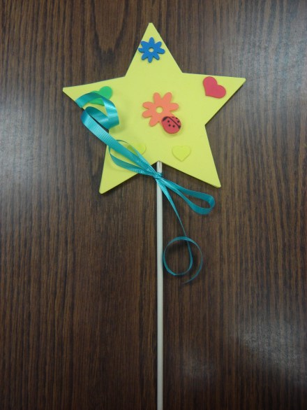 Because this was the last storytime of the summer session, I went all out and bought these foam star shapes. Then, my sister and I hot-glued them to the wooden dowels and tied the ribbon around them. The kids just put foam shapes on their “dance wands.”