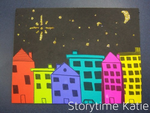 This simple paper craft came from an amazing teen volunteer years ago who drew these shapes for me and then cut them out. The program there were originally intended for never happened and I saved them — this storytime was absolutely perfect! I added glitter to make stars and other designs in the night sky.